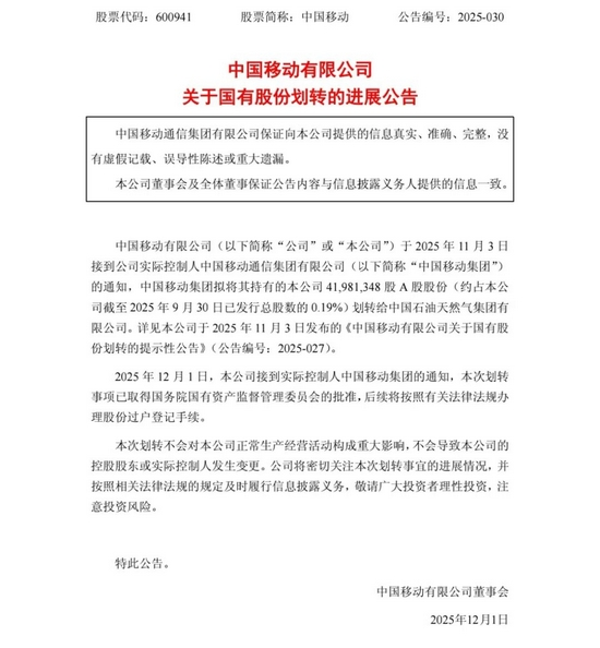 最新:中移动国有股份划转事项已获国务院国资委批准发表时间:2025-12-02 15:55来源:通信产业网 中国移动上市公司—中国移动有限公司今日发布“关于国有股份划转的进展公告”,公告显示,中国移动部分股权划转中石油事项已取得国务院国有资产监督管理委员会的批准。 公告说,中国移动有限公司(以下简称"公司"或"本公司")于2025年11月3日接到公司实际控制人中国移动通信集团有限公司(以下简称"中国移动集团")的通知,中国移动集团拟将其持有的本公司41,981,348股 A 股股份(约占本公司截至2025年9月30日已发行总股数的0.19%)划转给中国石油天然气集团有限公司。